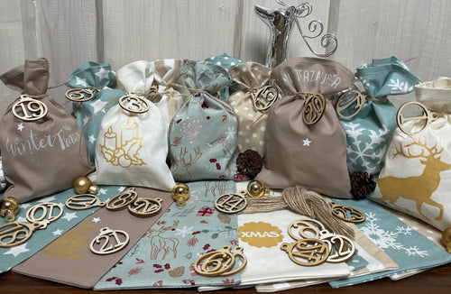 Adventskalender,Landhausstil Adventskalender zum Befüllen, 24 Säckchen zum Advent , Adventskalender Zahlen aus Holz, mint /grau/beige