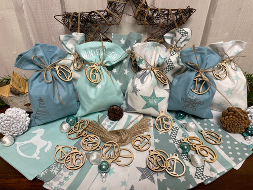 Adventskalender,Landhausstil Adventskalender zum Befüllen, 24 Säckchen zum Advent , Adventskalender Zahlen aus Holz, mint /weiß
