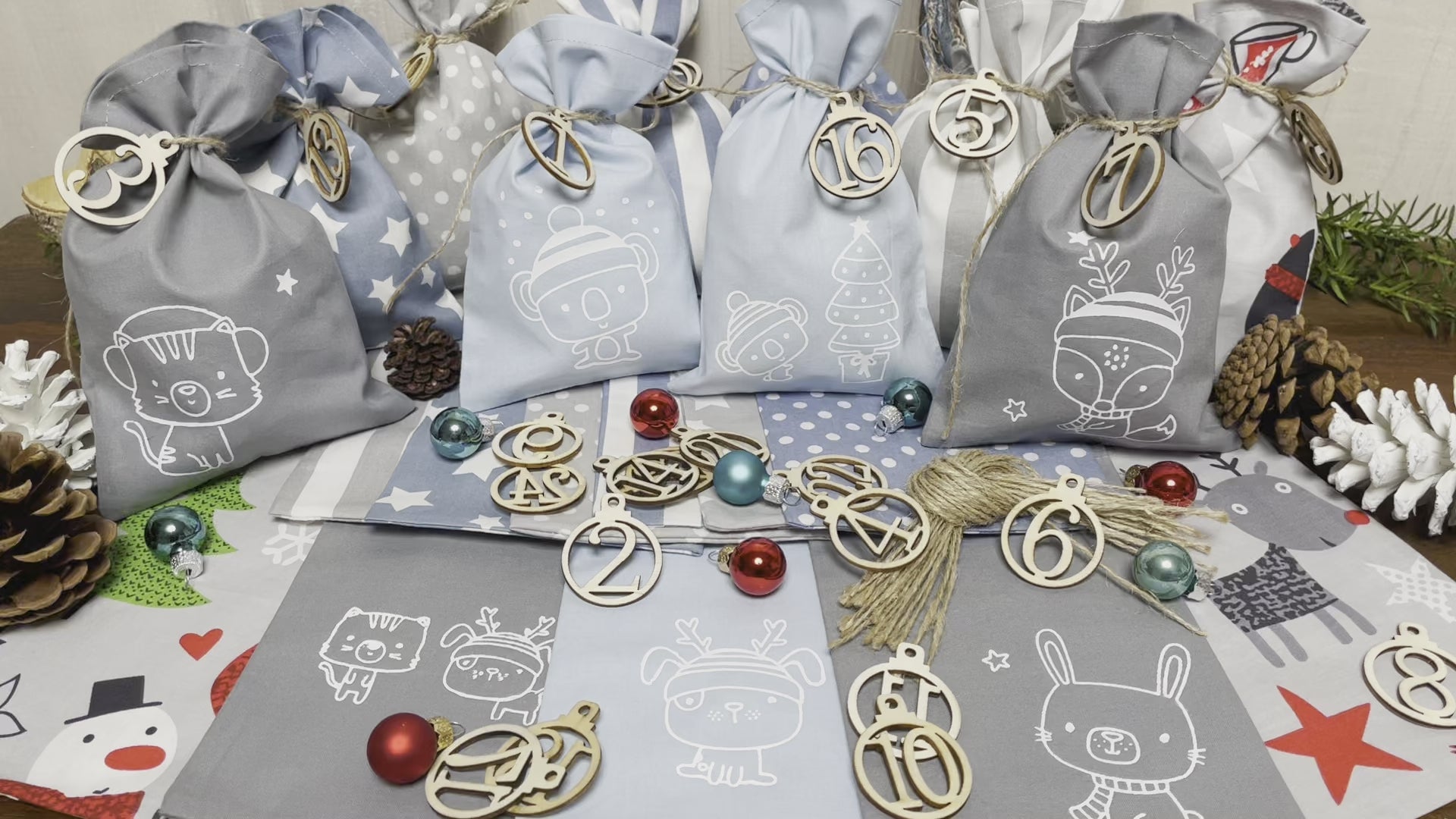 Adventskalender,Landhausstil Adventskalender zum Befüllen, 24 Säckchen zum Advent , Adventskalender Zahlen aus Holz, hellblau/grau