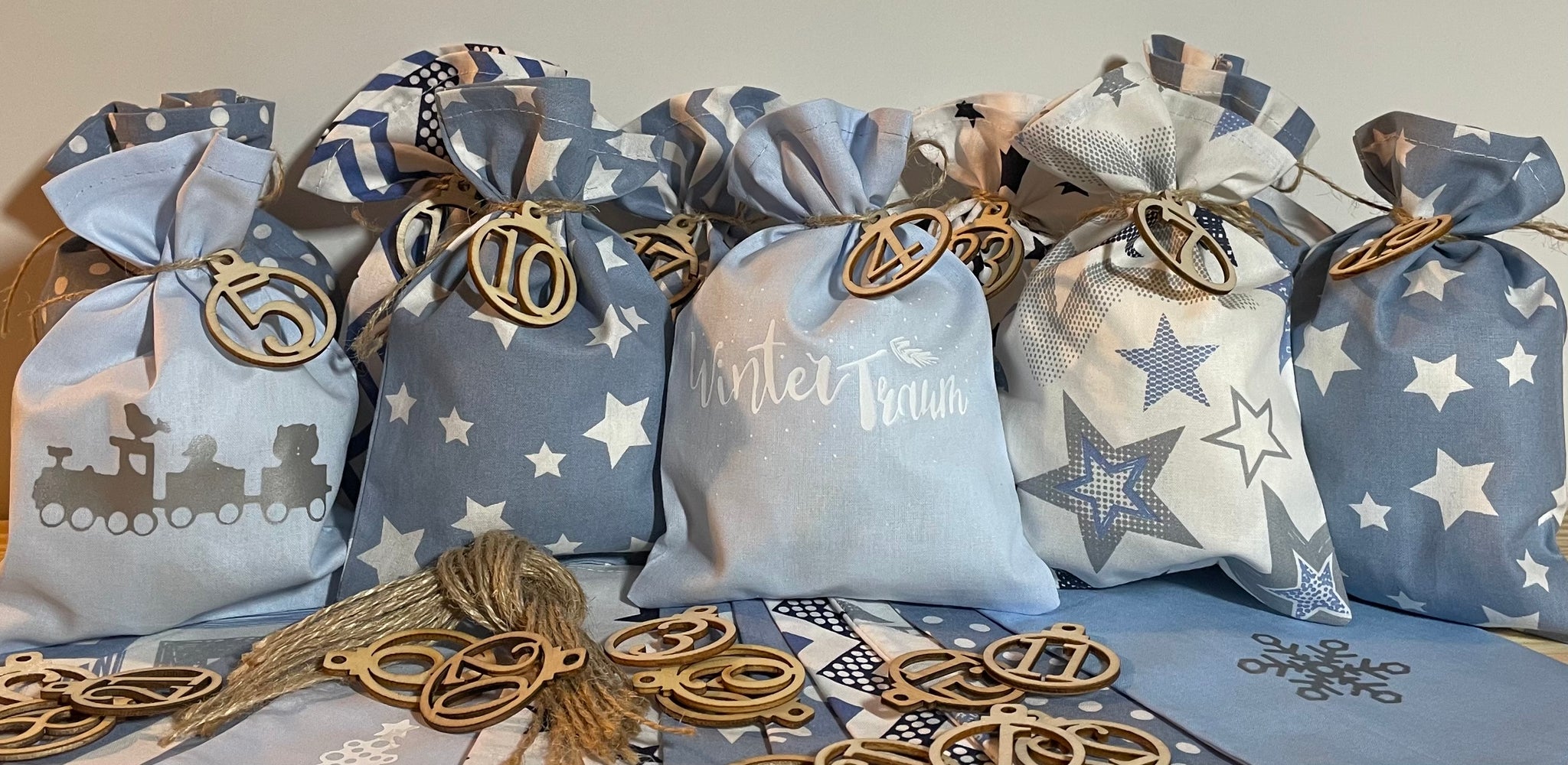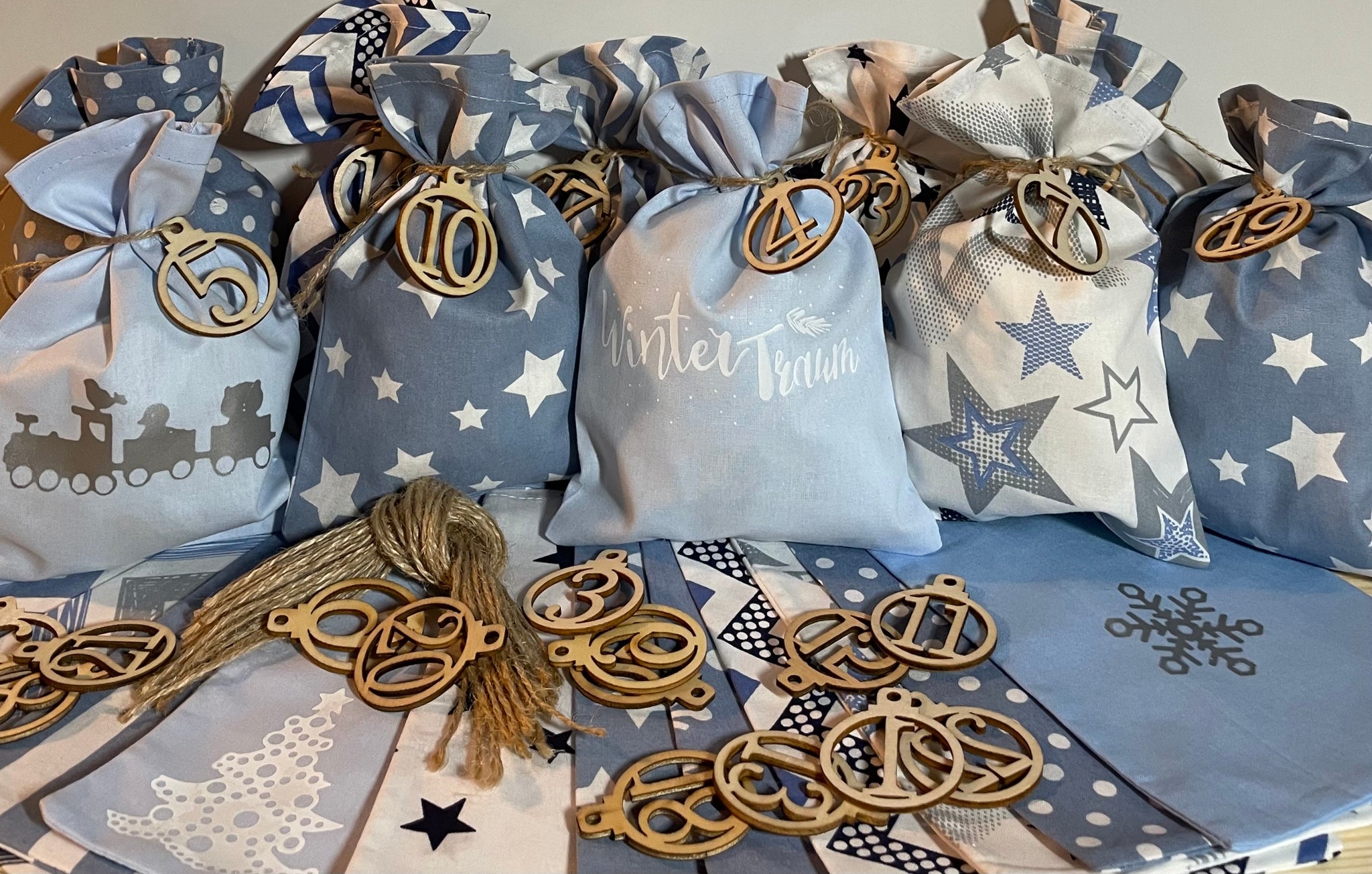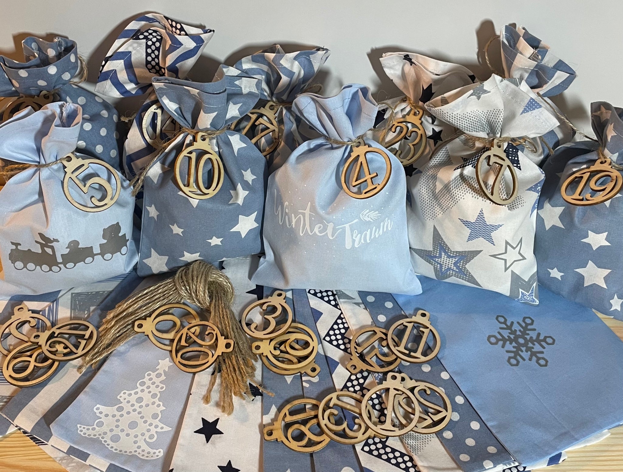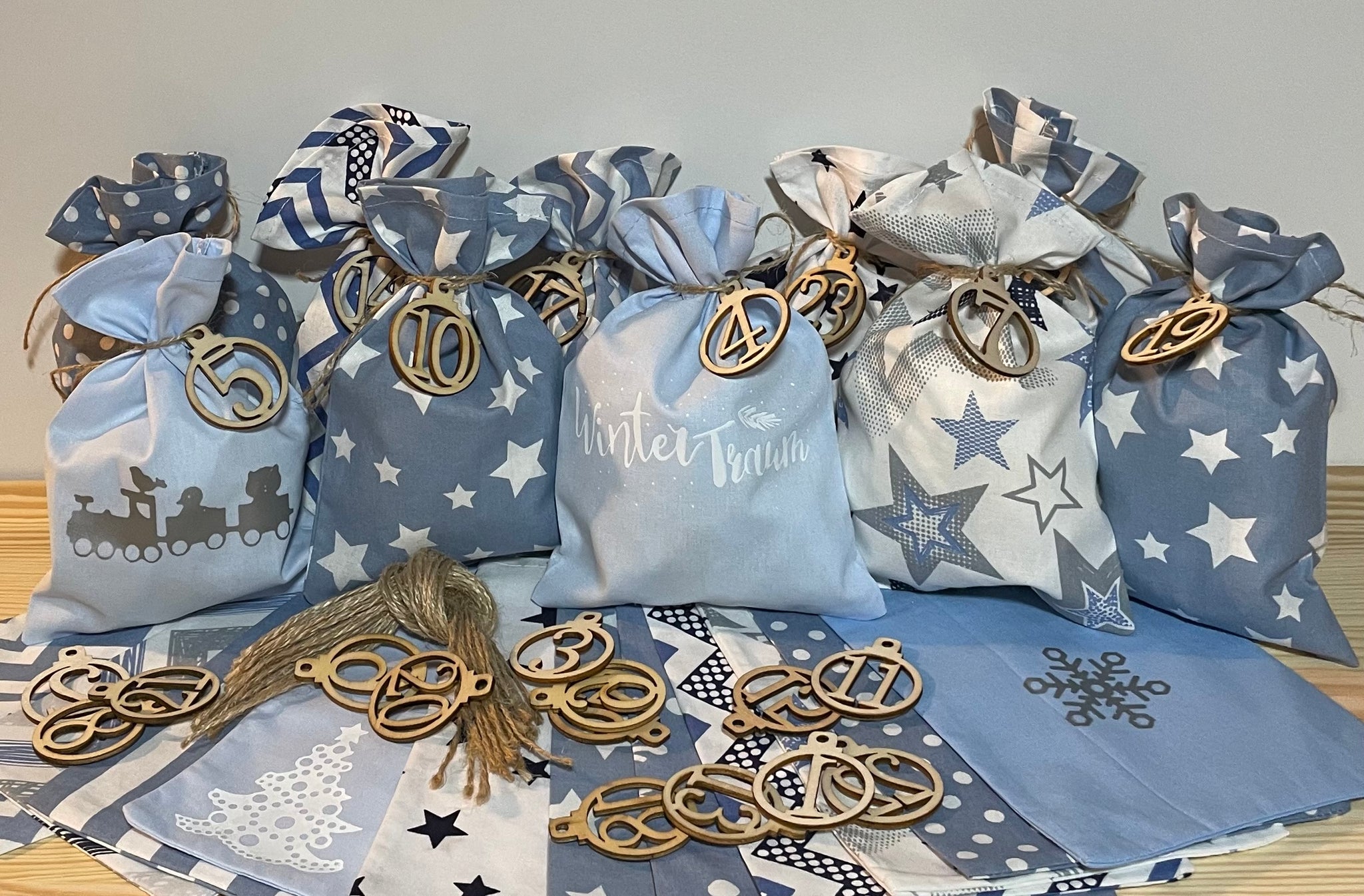 Adventskalender,Landhausstil Adventskalender zum Befüllen, 24 Säckchen zum Advent , Adventskalender Zahlen aus Holz, blau /weiß
