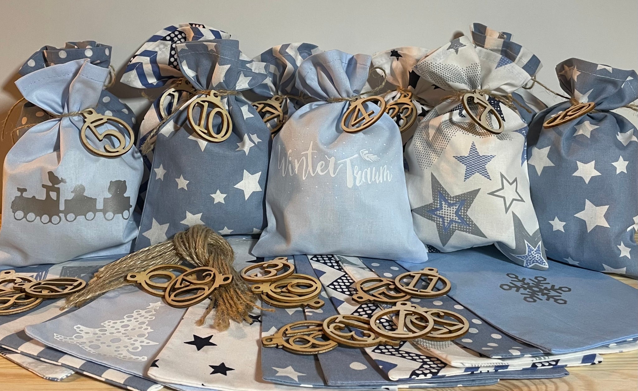 Landhausstil Adventskalender 24 Säckchen zum befüllen oder Deko für den Tannenbaum. Dazu 24 Adventszahlen aus Holz + 24st. Jute Kordel.