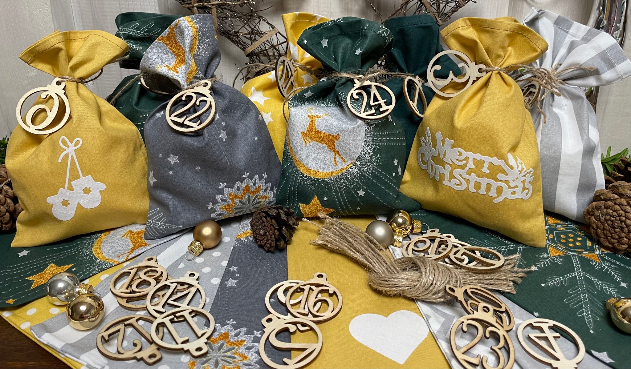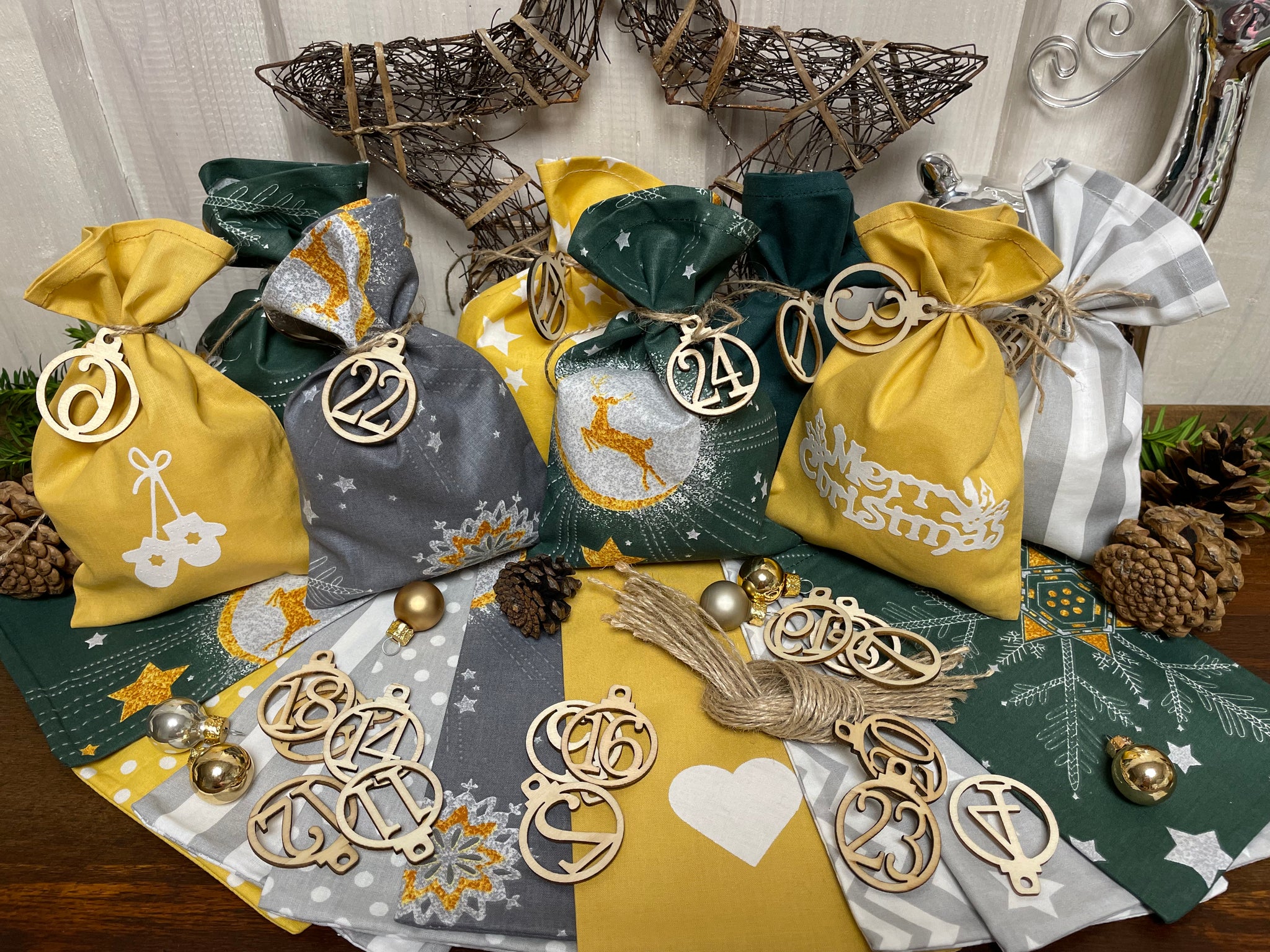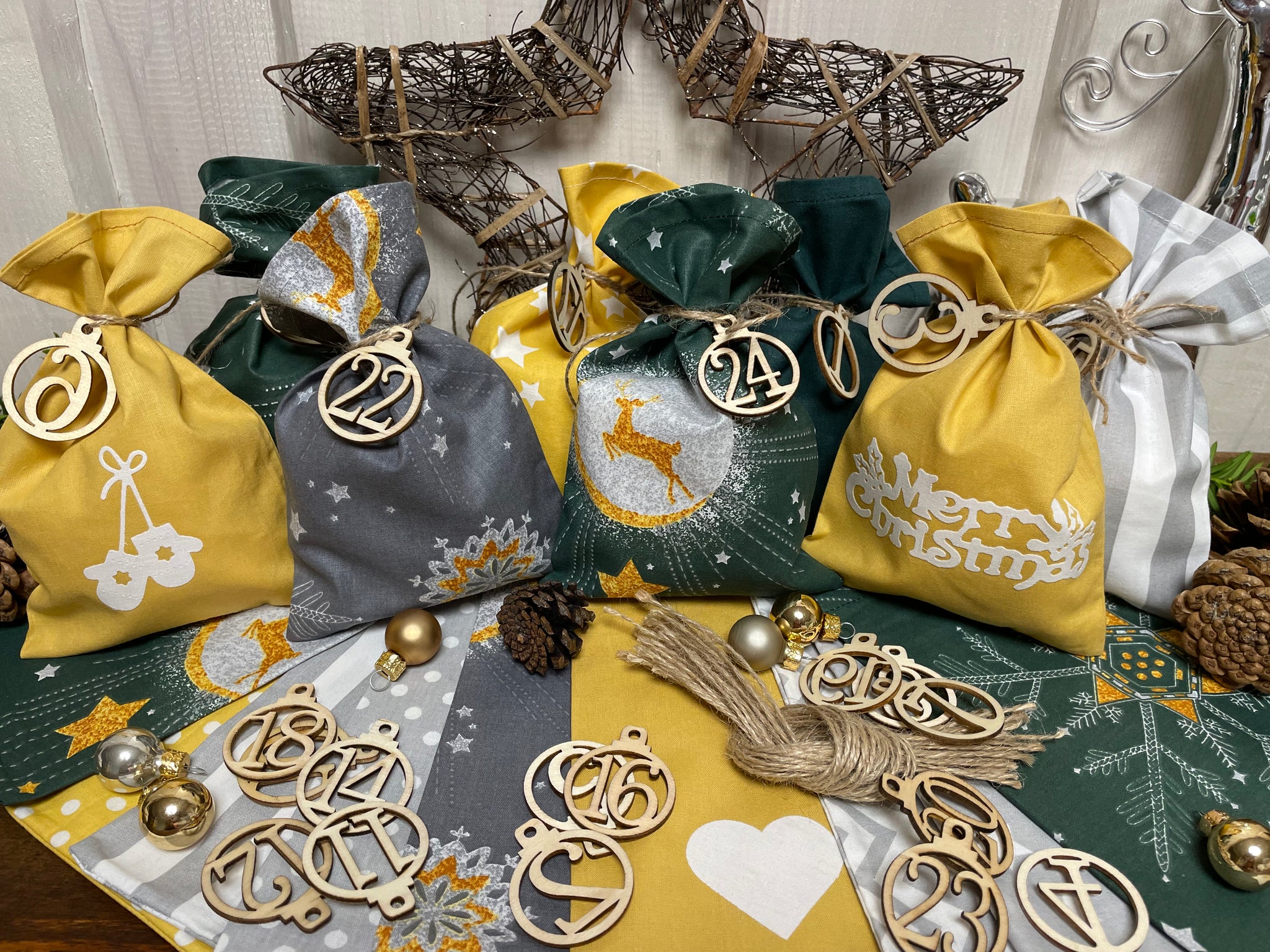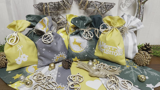 Landhausstil Adventskalender 24 Säckchen zum befüllen oder Deko für den Tannenbaum. Dazu 24 Adventszahlen aus Holz + 24st. Jute Kordel.