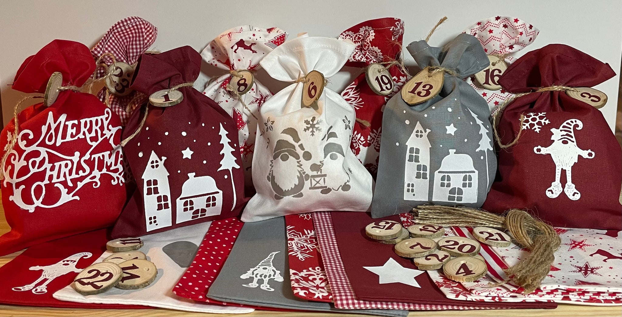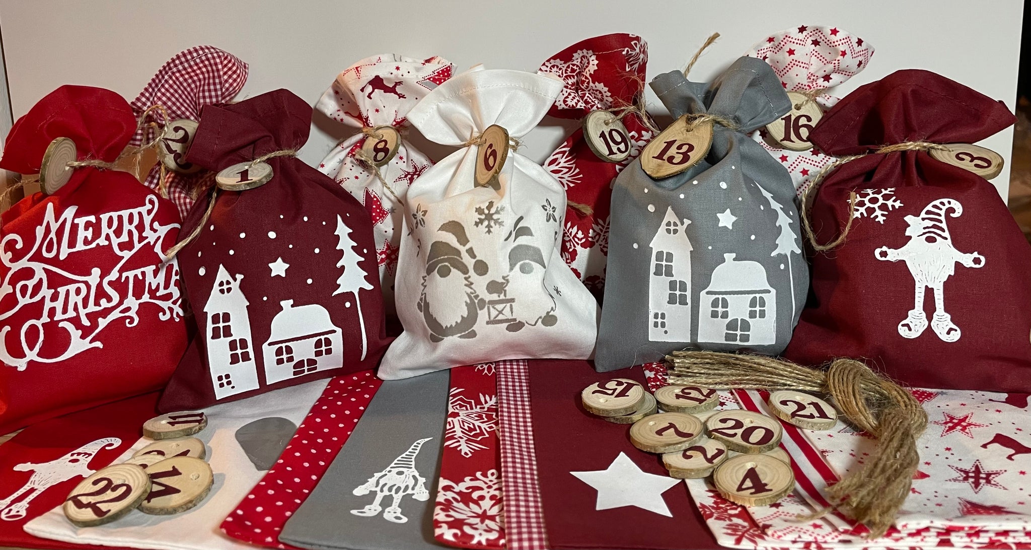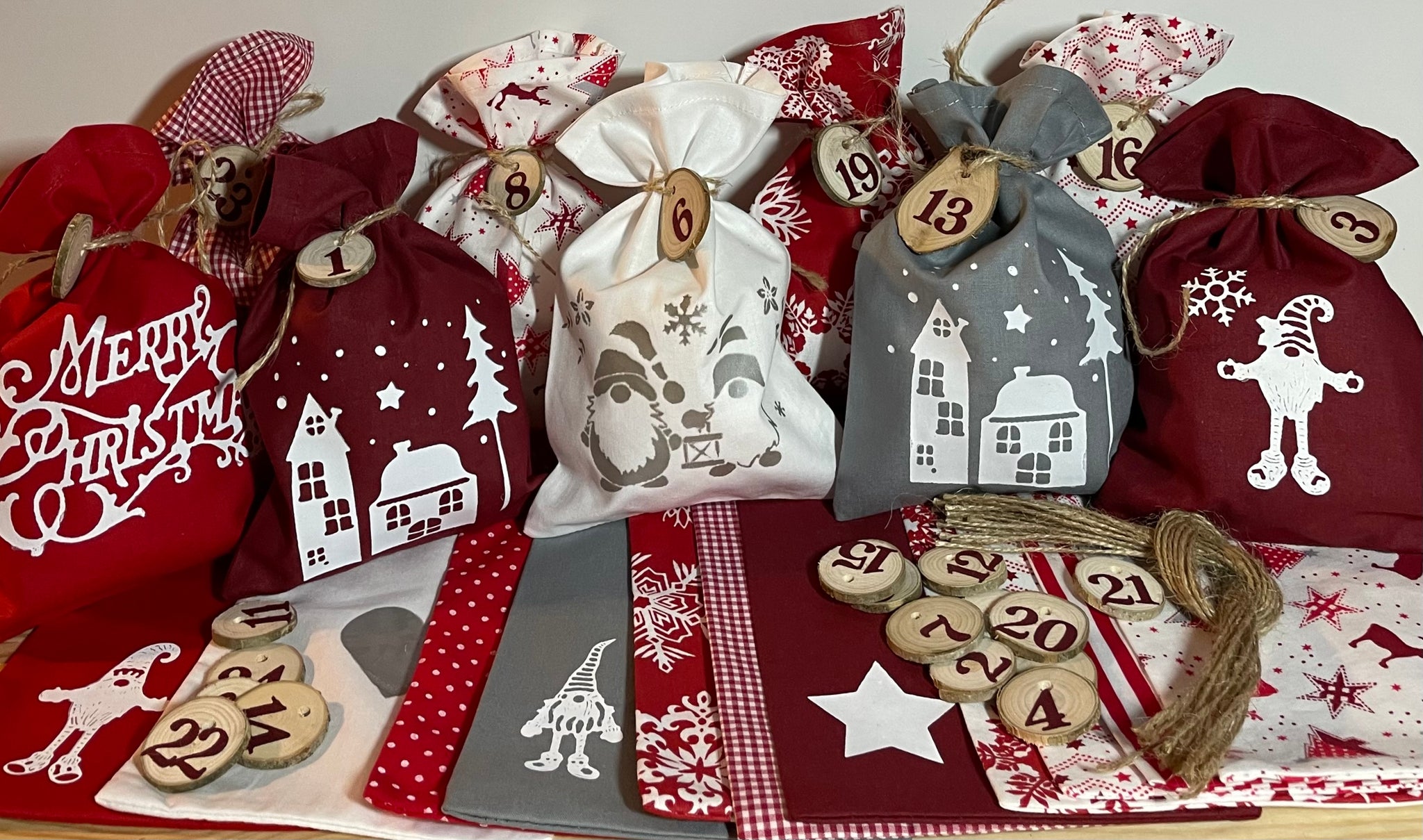Landhausstil Adventskalender 24 Säckchen zum befüllen oder Deko für den Tannenbaum. Dazu 24 Adventszahlen aus Holz + 24st. Jute Kordel