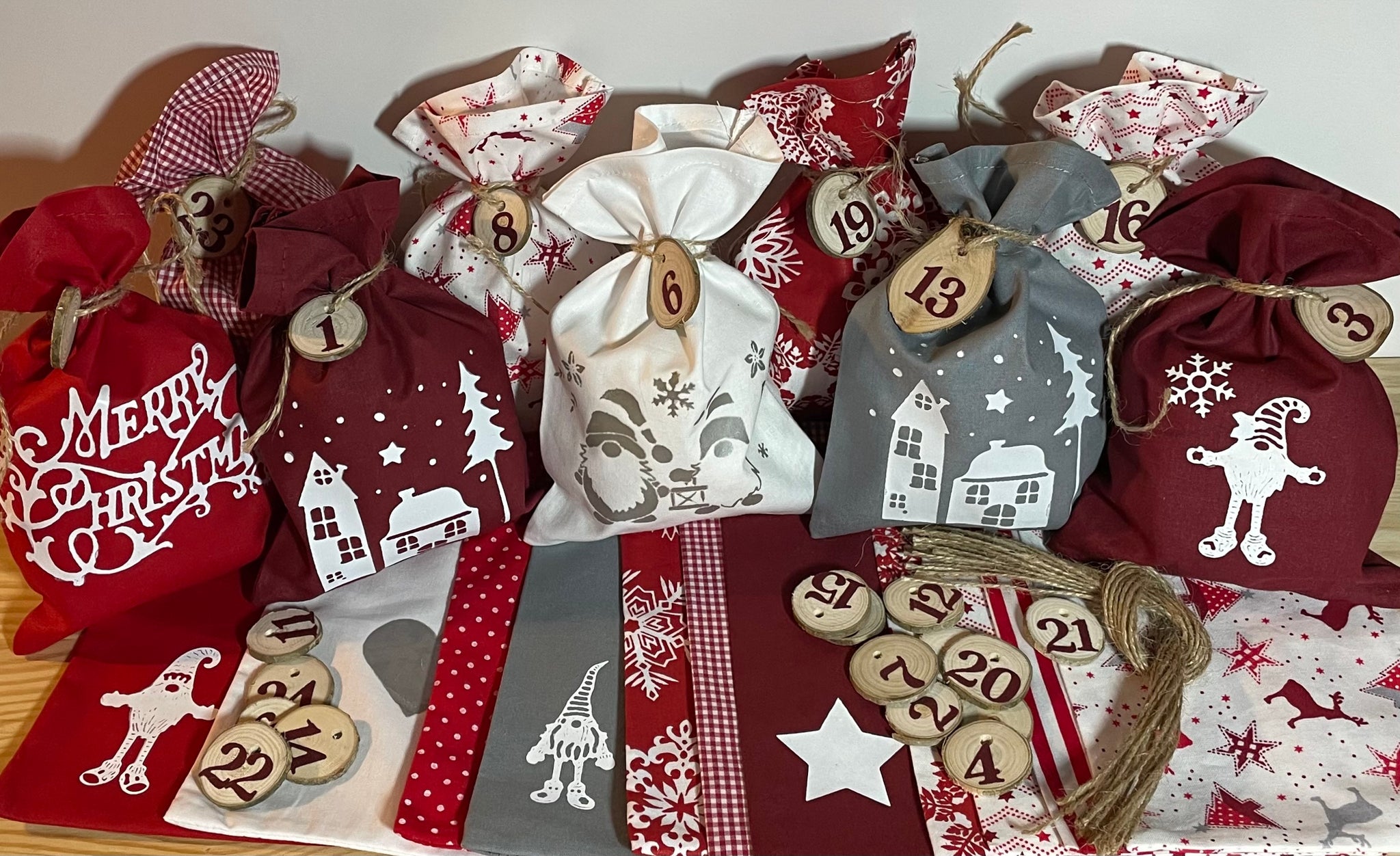 Adventskalender,Landhausstil Adventskalender zum befüllen, 24 Säckchen zum Advent, Adventskalender Zahlen aus Holz, grau/rot