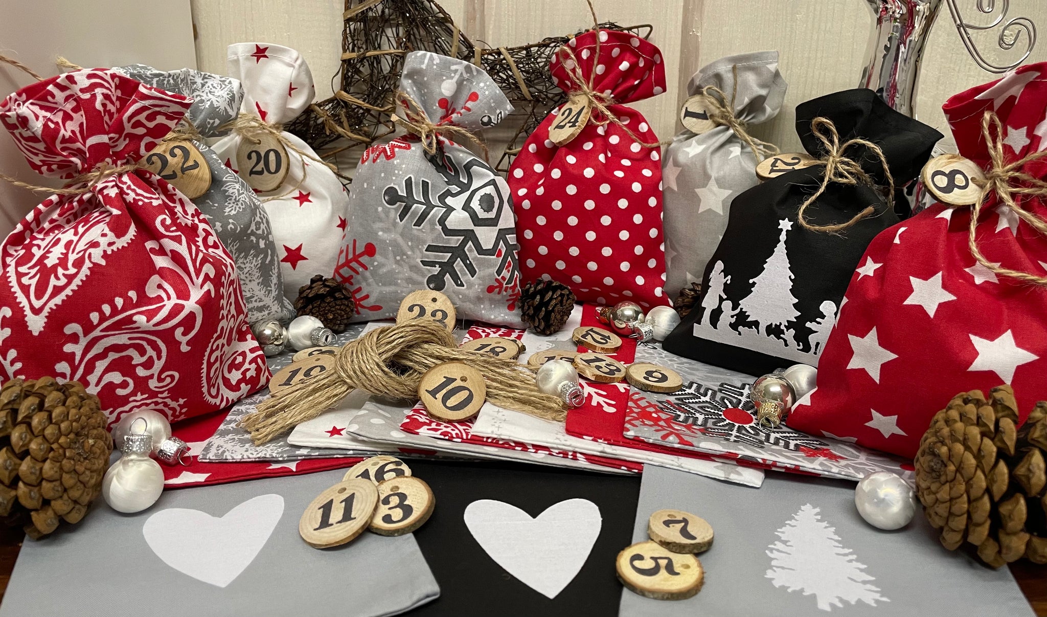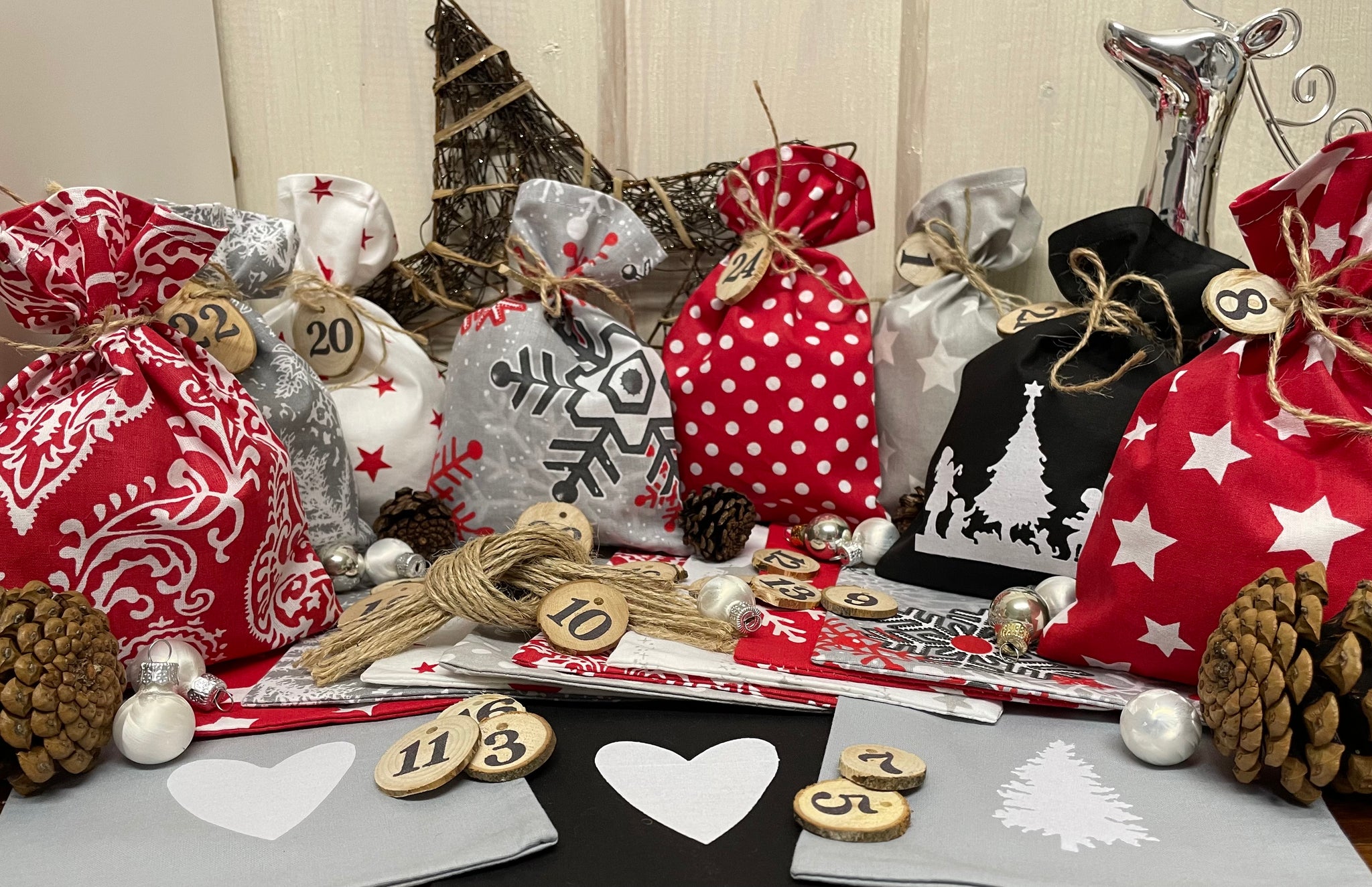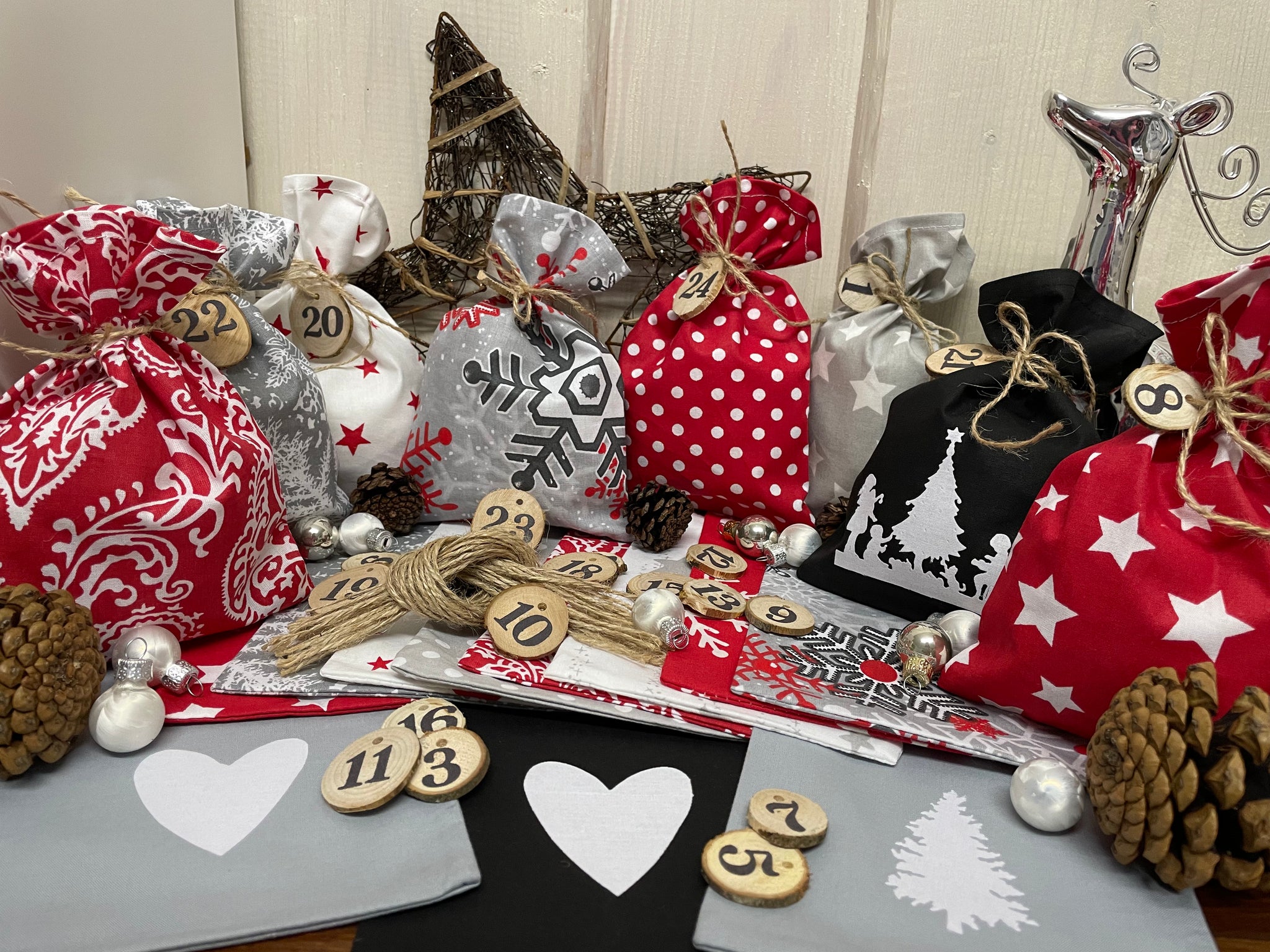 Adventskalender,Landhausstil Adventskalender zum befüllen, 24 Säckchen zum Advent, Adventskalender Zahlen aus Holz, grau/rot/schwarz