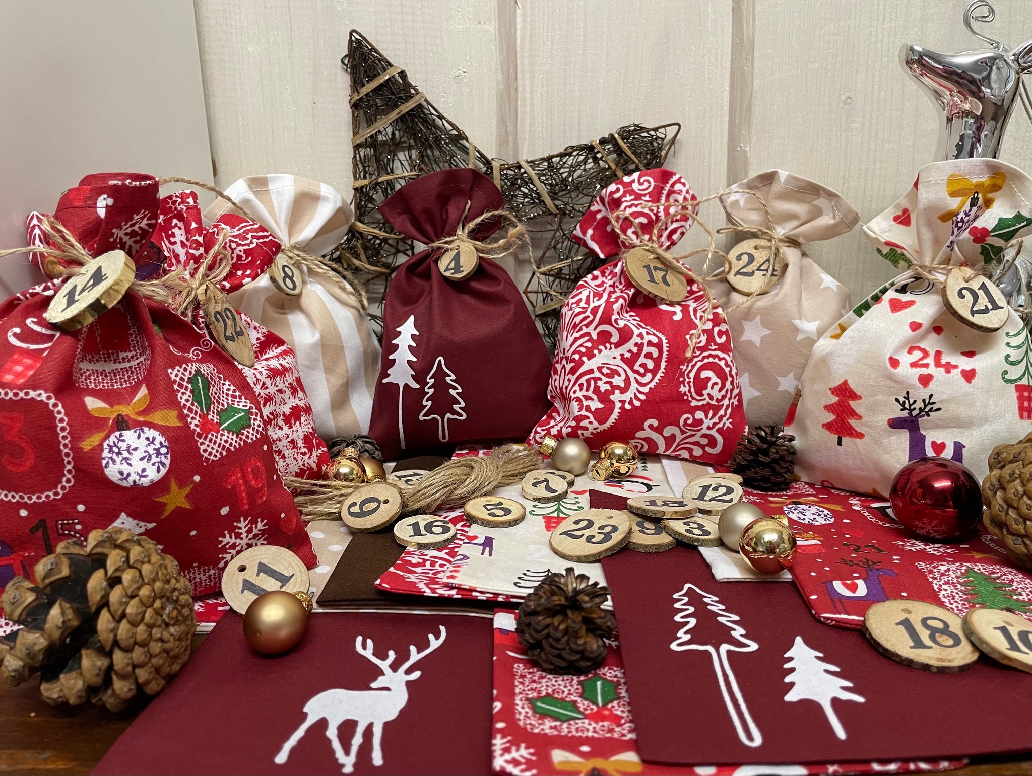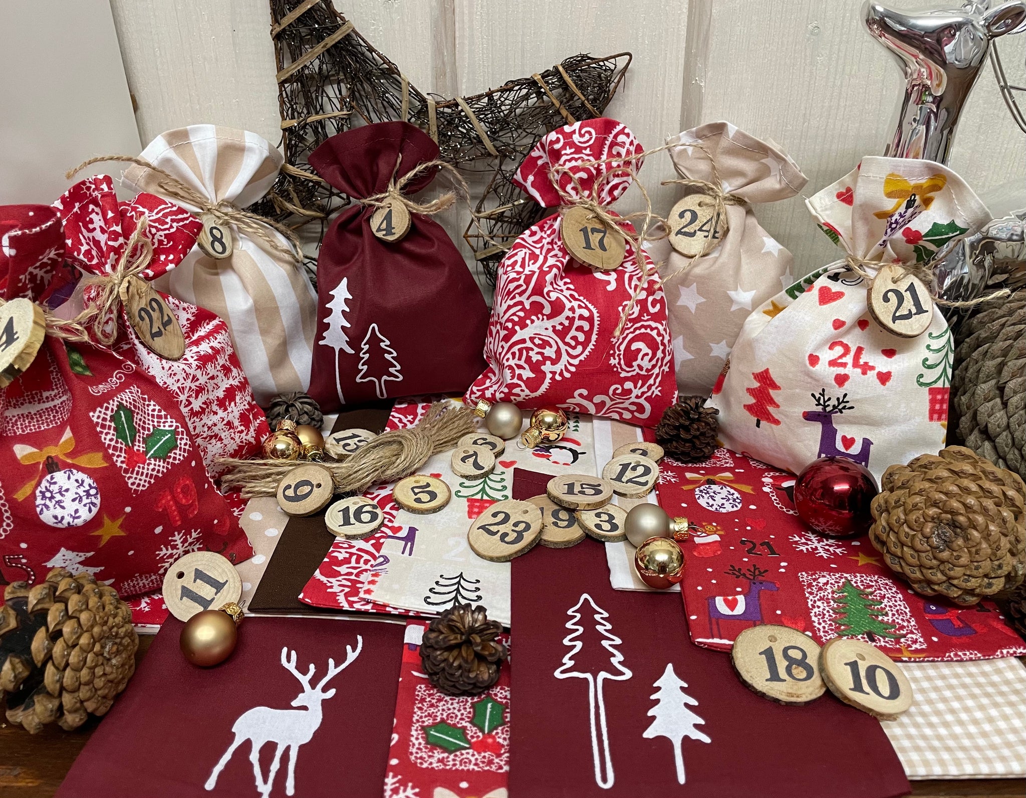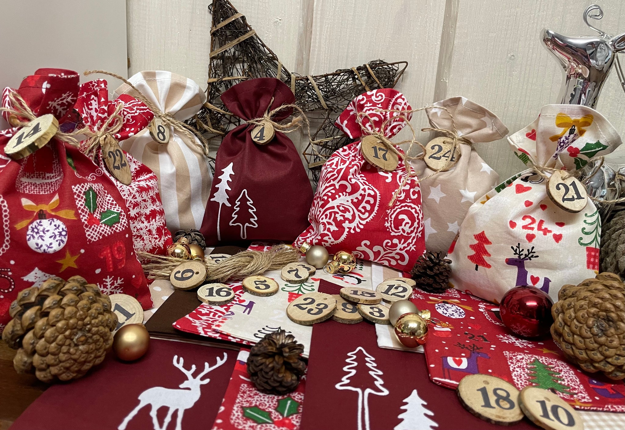 Adventskalender,Landhausstil Adventskalender zum Befüllen, 24 Säckchen zum Advent , Adventskalender Zahlen aus Holz, rot/beige