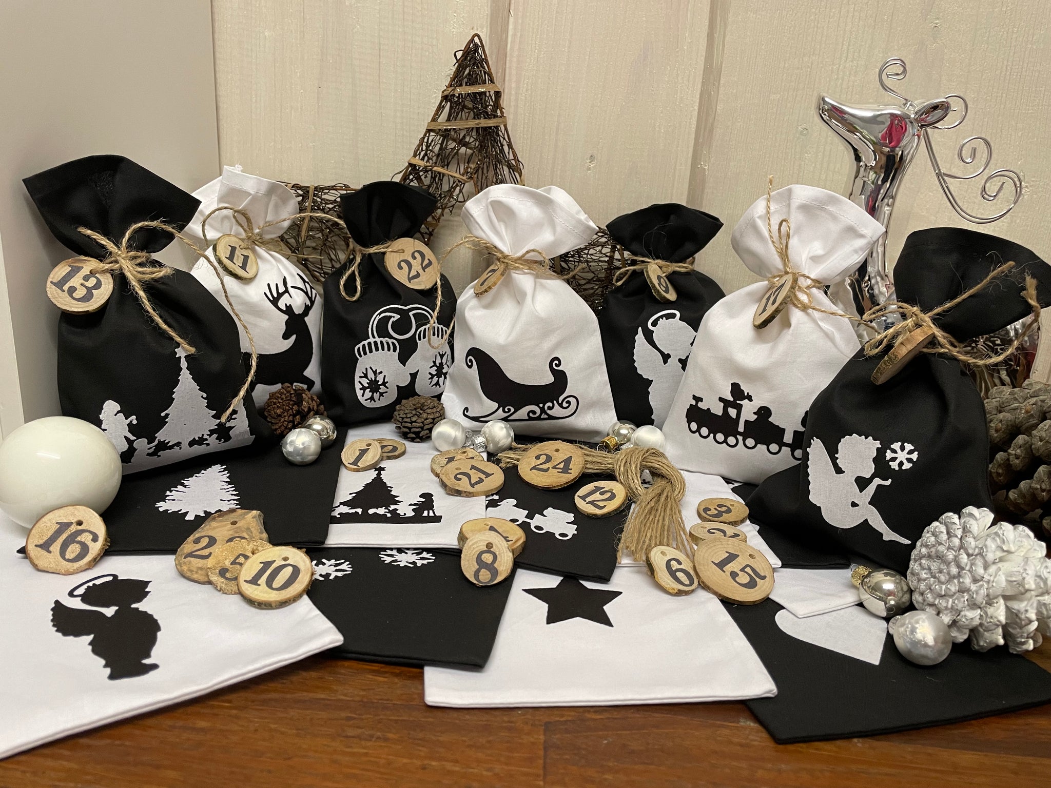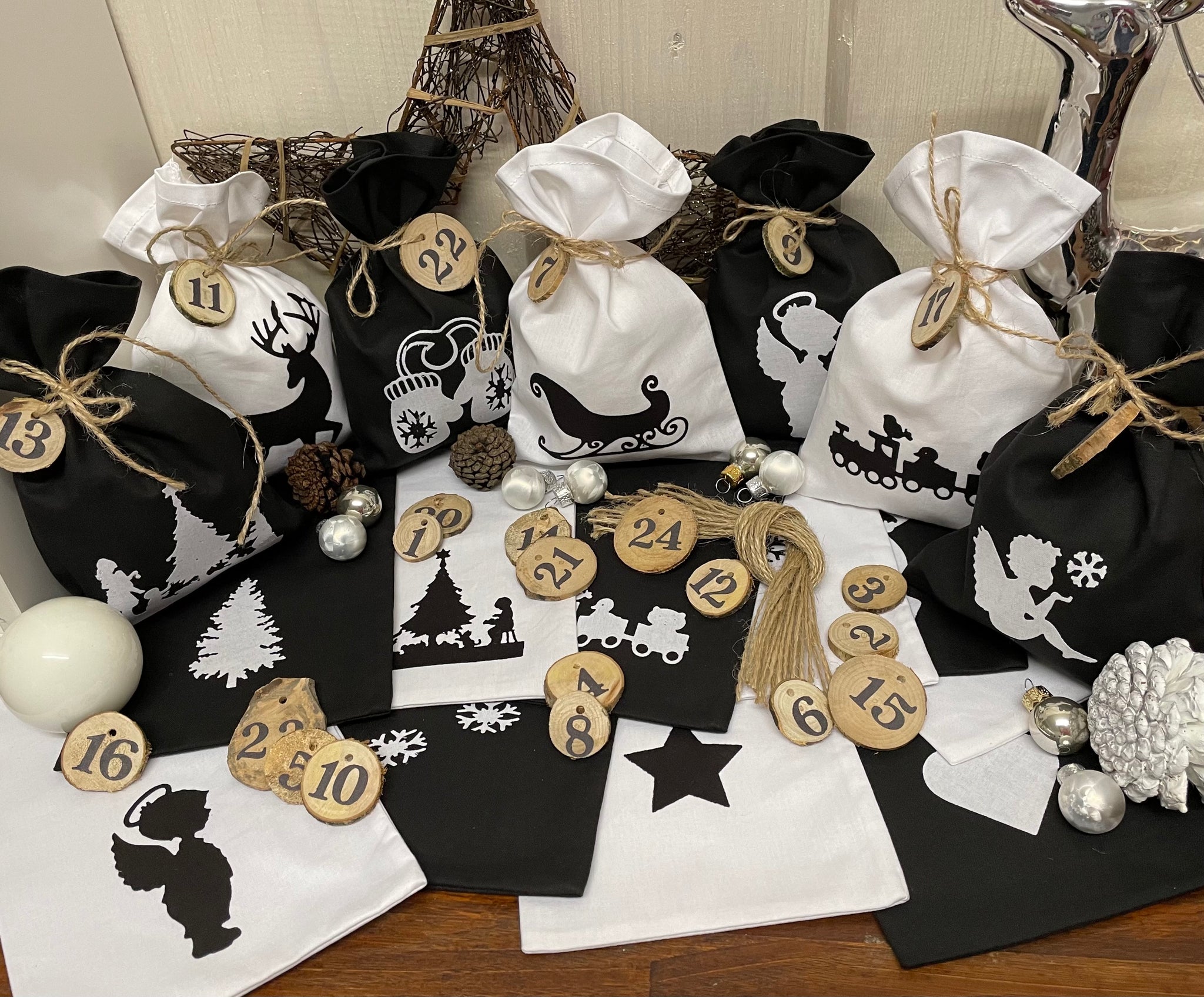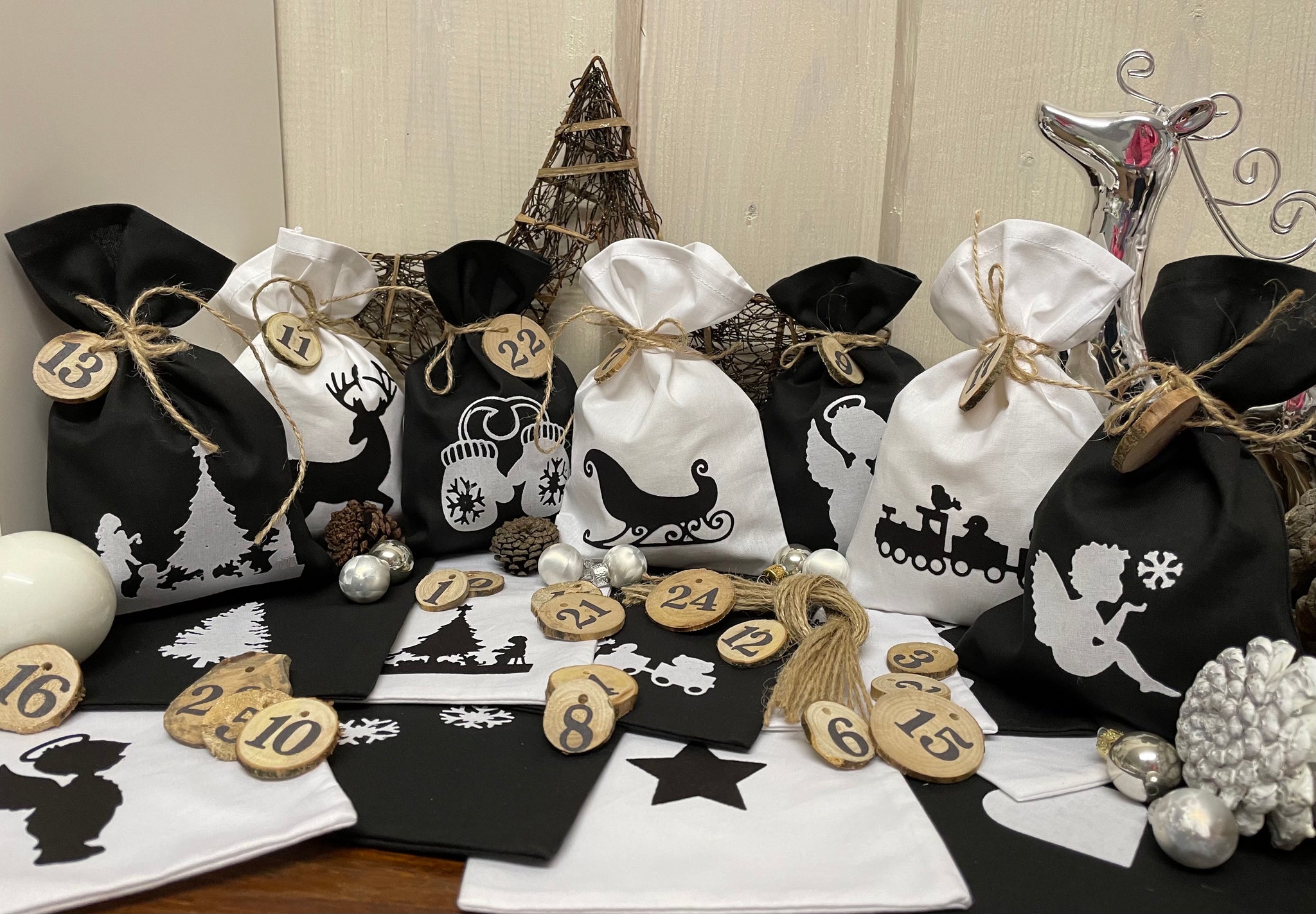 Landhausstil Adventskalender 24 Säckchen zum befüllen oder Deko für den Tannenbaum. Dazu 24 Adventszahlen aus Holz + 24st. Jute Kordel.