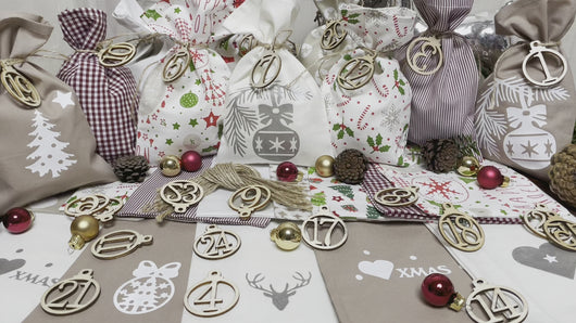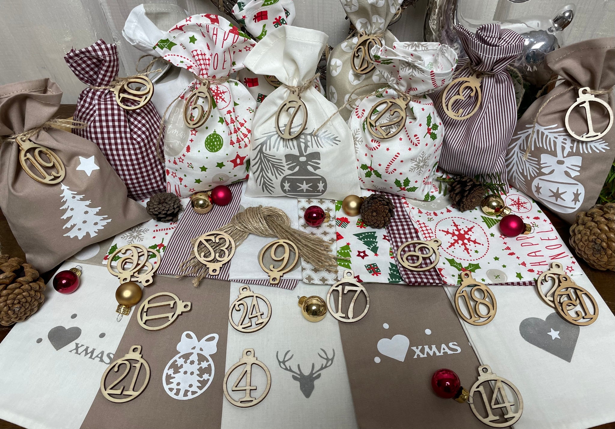 Landhausstil Adventskalender 24 Säckchen zum befüllen oder Deko für den Tannenbaum. Dazu 24 Adventszahlen aus Holz + 24st. Jute Kordel.