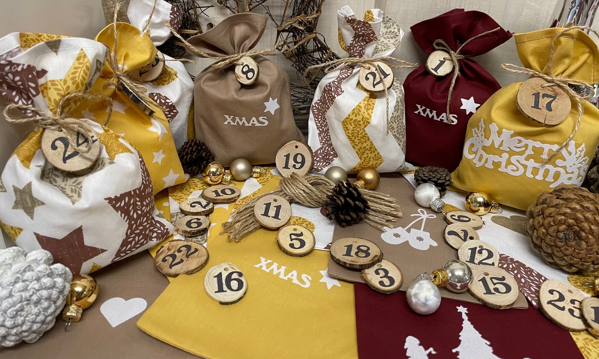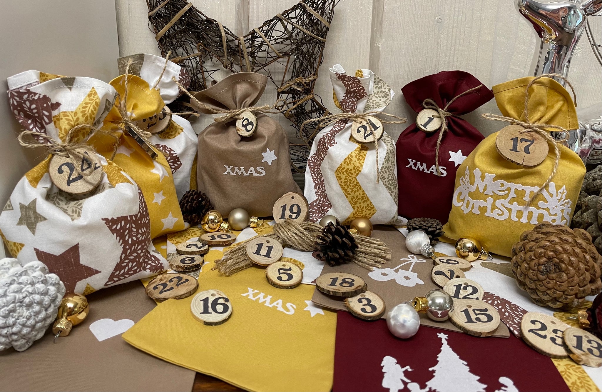 Landhausstil Adventskalender 24 Säckchen zum befüllen oder Deko für den Tannenbaum. Dazu 24 Adventszahlen aus Holz + 24st. Jute Kordel