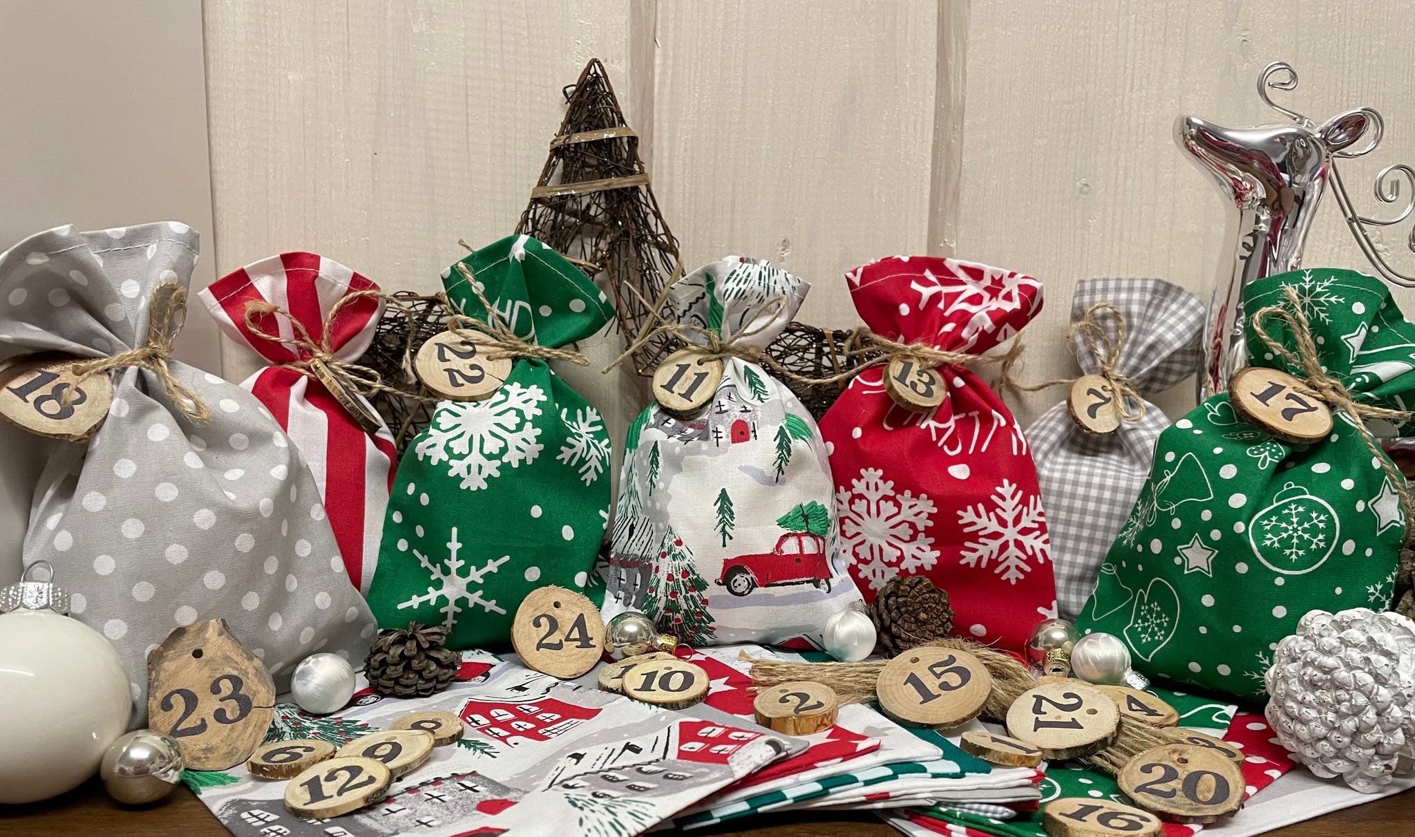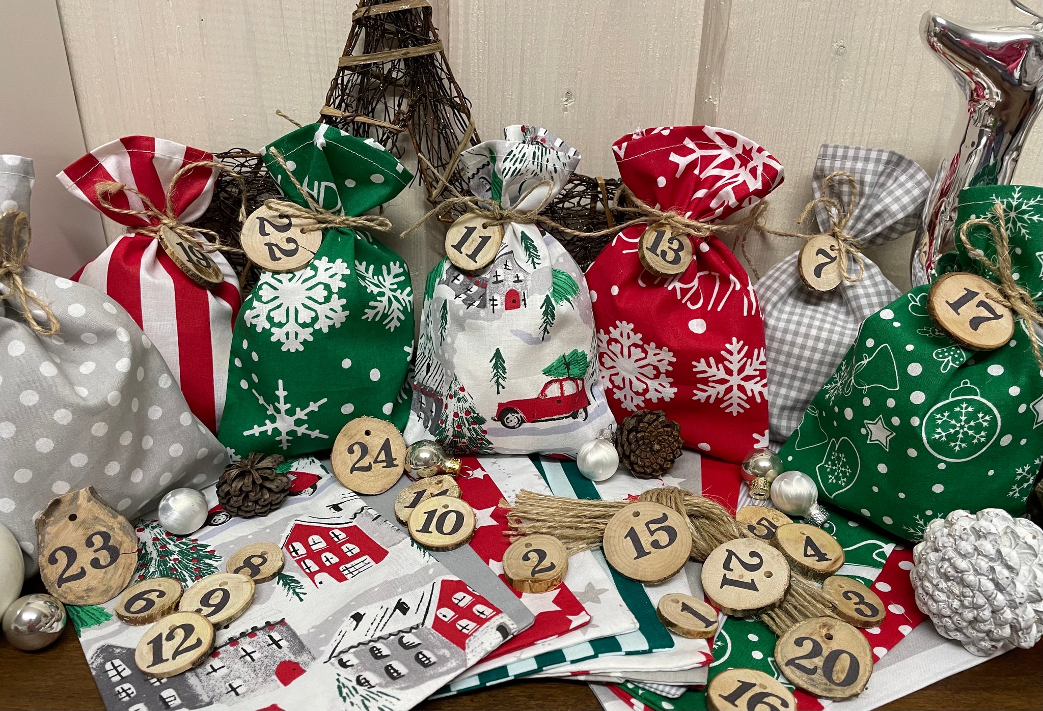 Landhausstil Adventskalender 24 Säckchen zum befüllen oder Deko für den Tannenbaum. Dazu 24 Adventszahlen aus Holz + 24st. Jute Kordel.