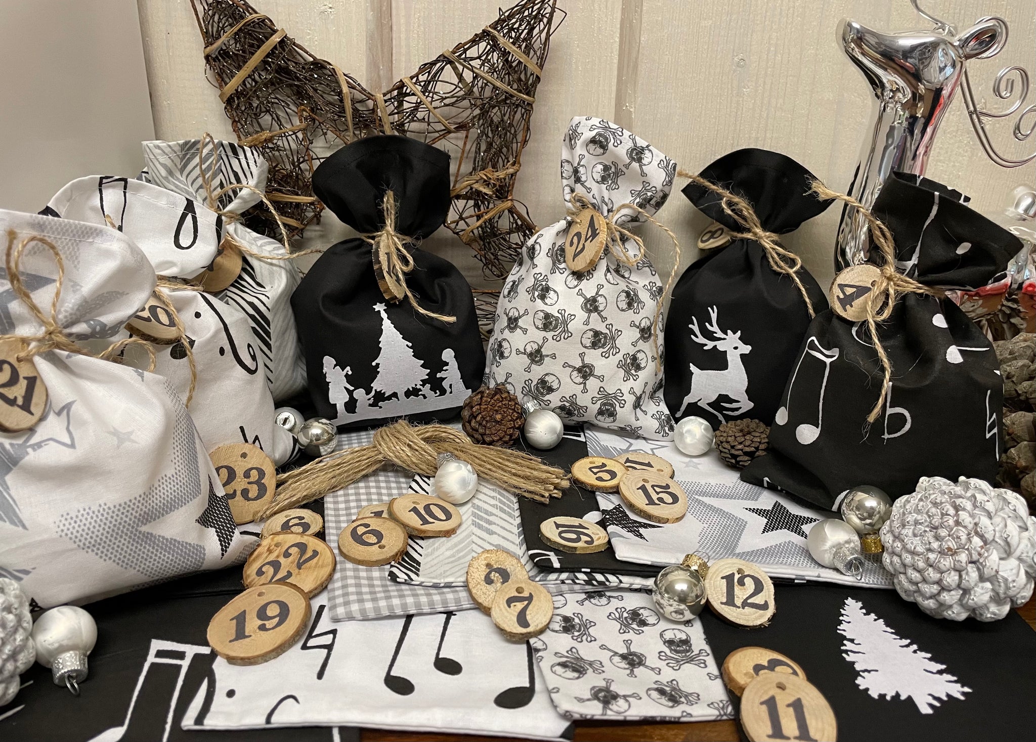 Landhausstil Adventskalender 24 Säckchen zum befüllen oder Deko für den Tannenbaum. Dazu 24 Adventszahlen aus Holz + 24st. Jute Kordel.