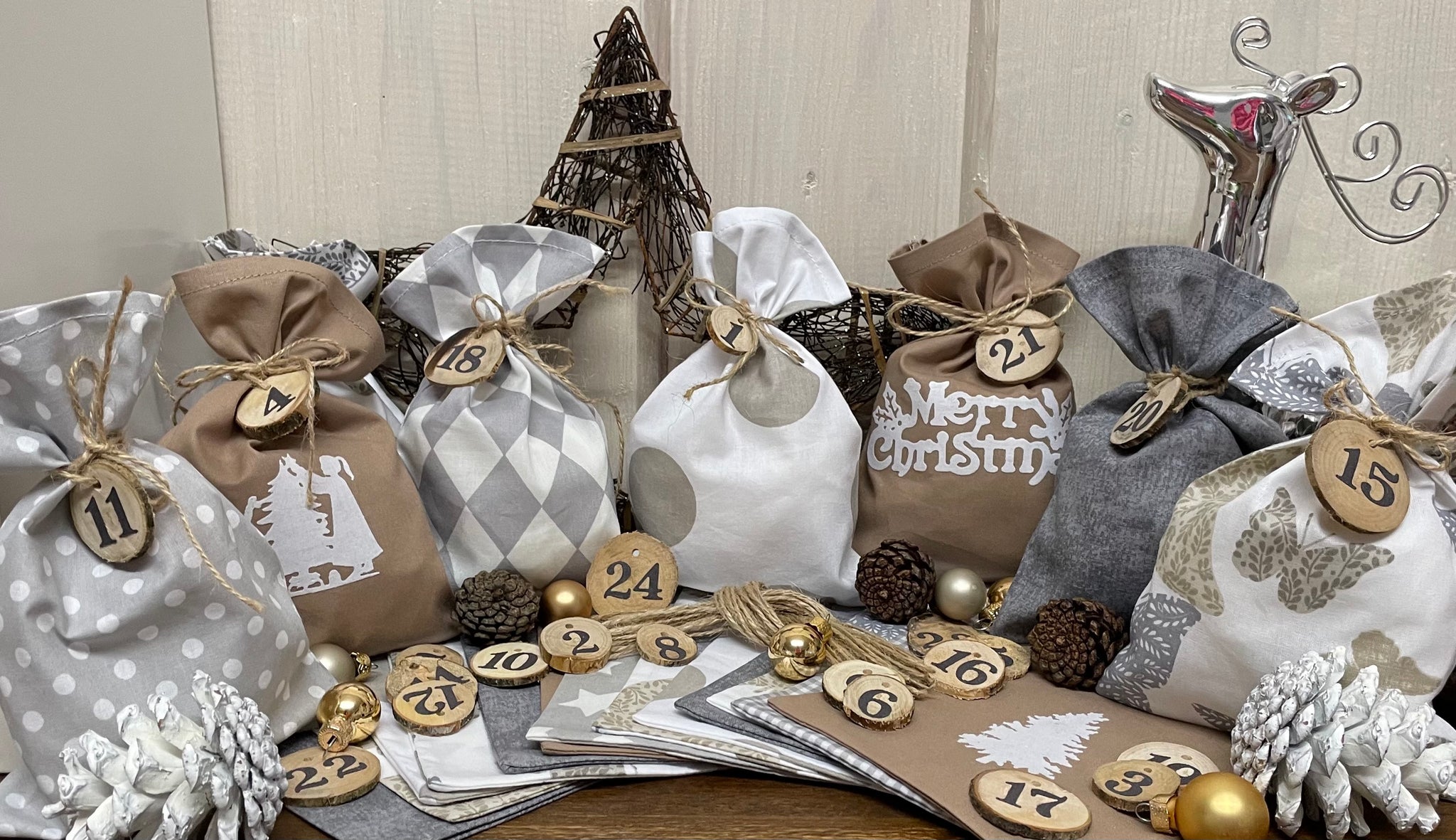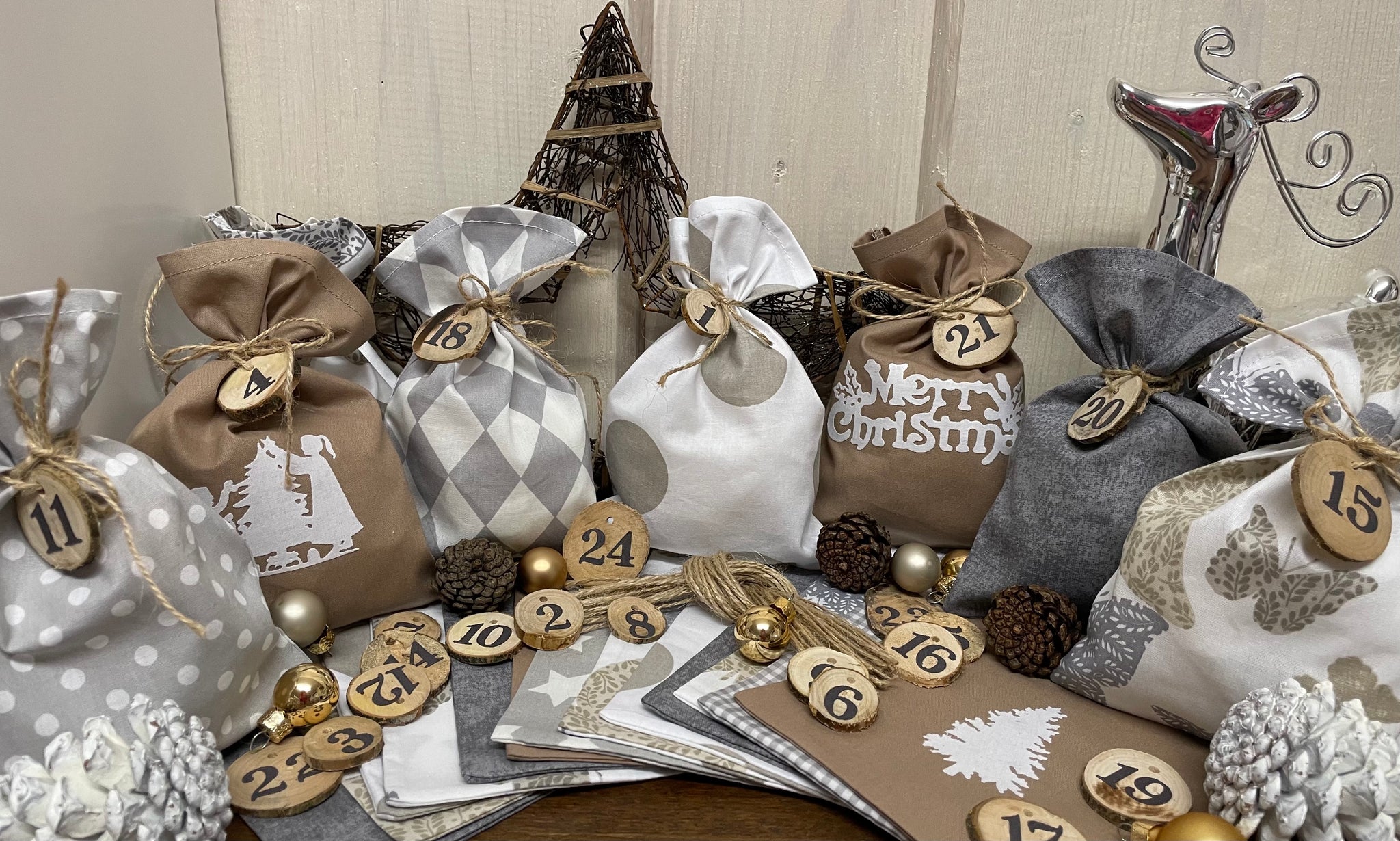 Landhausstil Adventskalender 24 Säckchen zum befüllen oder Deko für den Tannenbaum. Dazu 24 Adventszahlen aus Holz + 24st. Jute Kordel