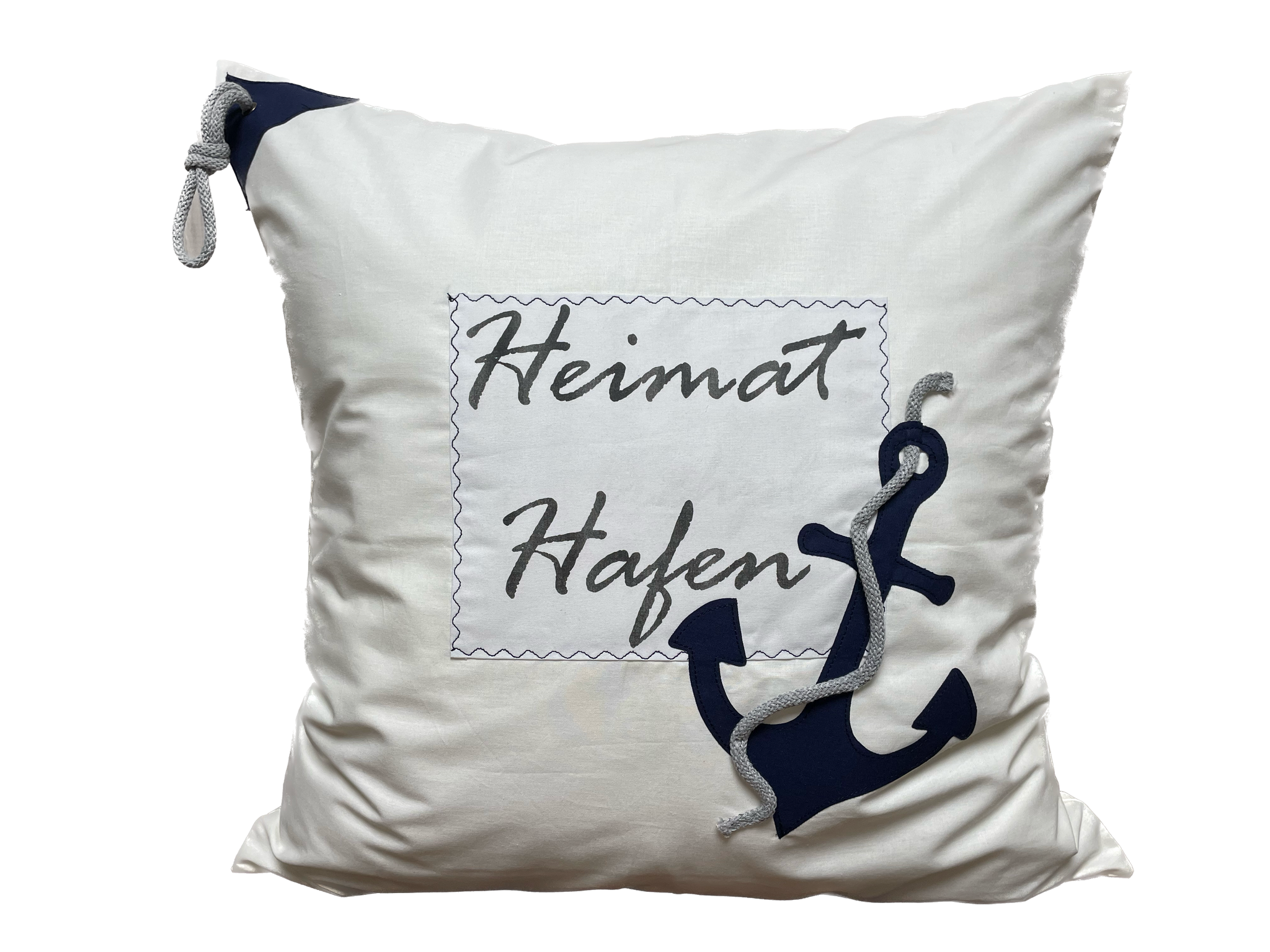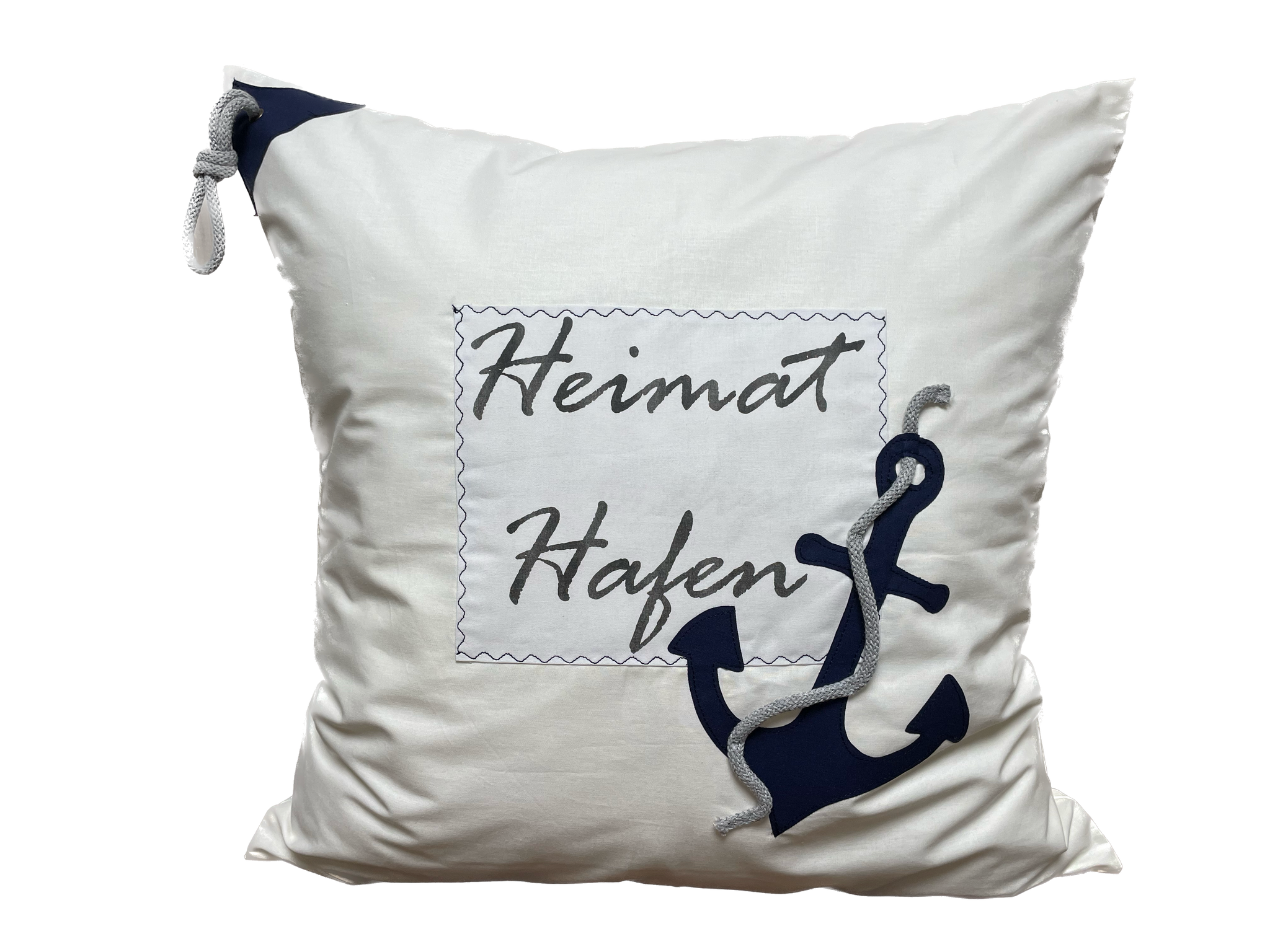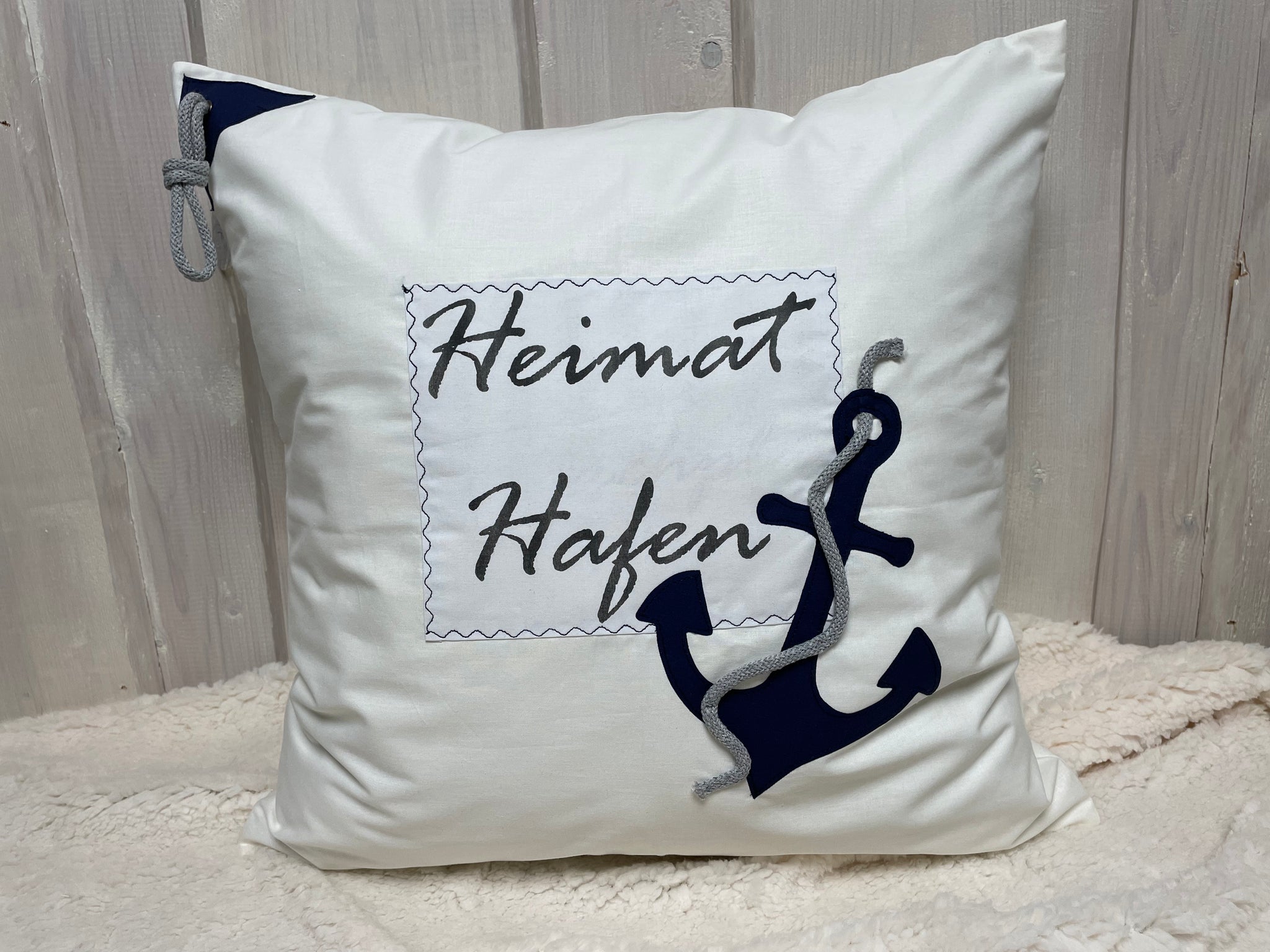 Maritime Kissenhülle, Kissenbezug, Landhausstil Dekokissen * Heimathafen * blau/weiß/beige
