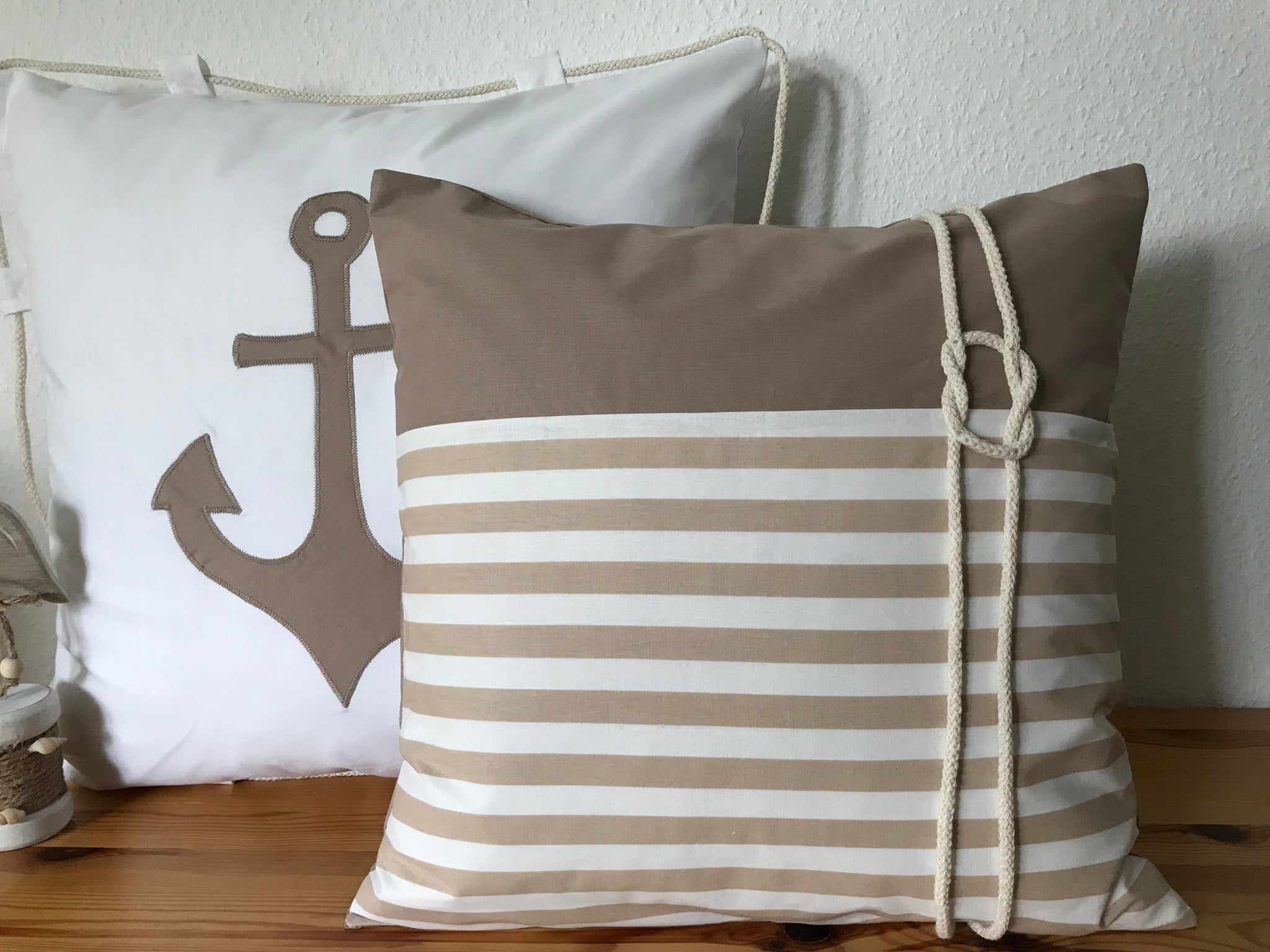 Maritime Kissenhülle, Kissenbezug, Landhausstil Kissenhüllen, Dekokissen Seemannsknoten beige/weiß gestreift