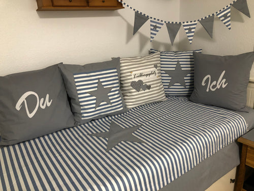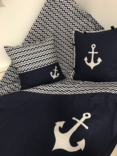 Maritime Patchwork Decke, Tagesdecke, Kinderdecke, Bettüberwurf 130cm x 200cm blau/grau
