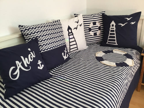 Maritime Patchwork Decke, Tagesdecke, Kinderdecke, Bettüberwurf 130cm x 200cm blau/weiß gestreift