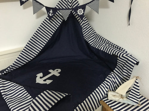 Maritime Patchwork Decke, Tagesdecke, Kinderdecke, Bettüberwurf 130cm x 200cm blau/weiß