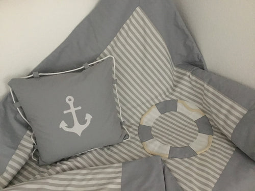 Maritime Patchwork Decke, Tagesdecke, Kinderdecke, Bettüberwurf 130cm x 200cm grau/weiß