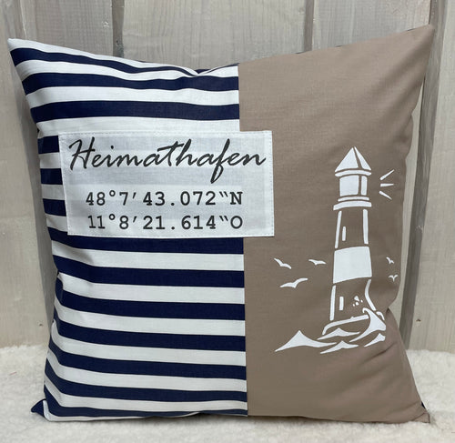 Maritimer Kissenbezug personalisiert mit den Koordinaten von deinem Zuhause * Heimathafen … * blau/weiß/beige