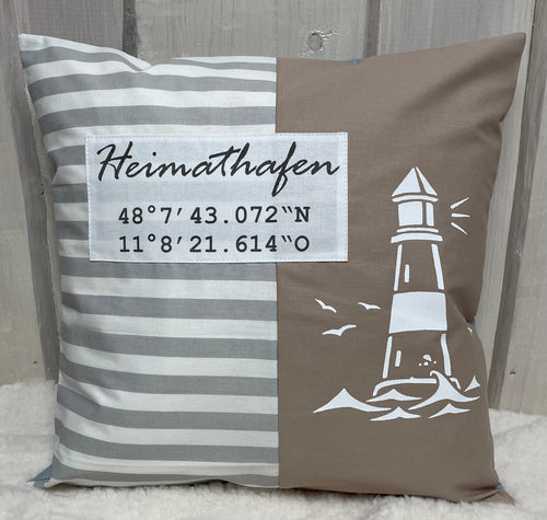 Maritimer Kissenbezug personalisiert mit den Koordinaten von deinem Zuhause * Heimathafen * grau/weiß/beige