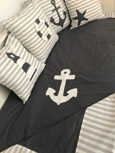 Maritime Patchwork Decke, Tagesdecke, Kinderdecke, Bettüberwurf 130cm x 200cm grau/weiß
