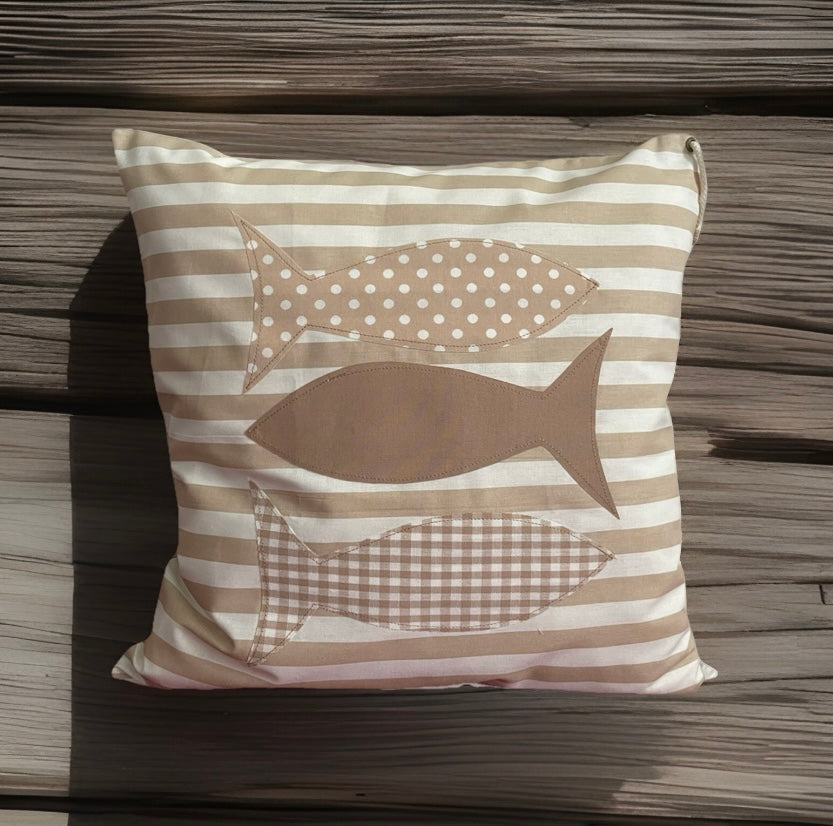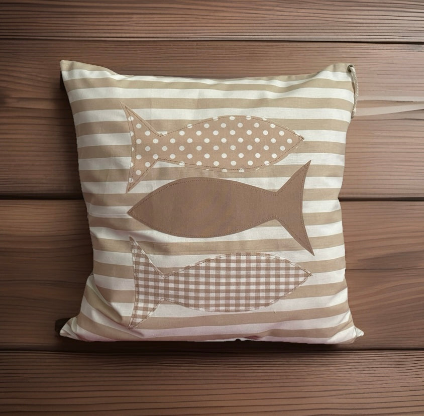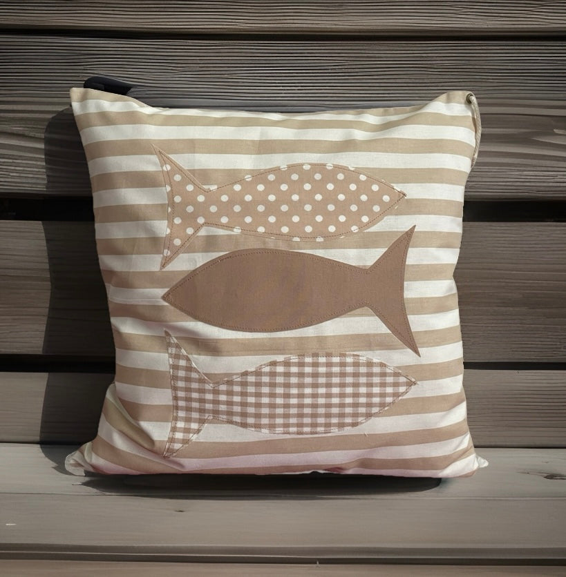 Maritime Kissenhülle, Landhausstil Kissenbezug, Dekokissen *Fische* beige/weiß gestreift